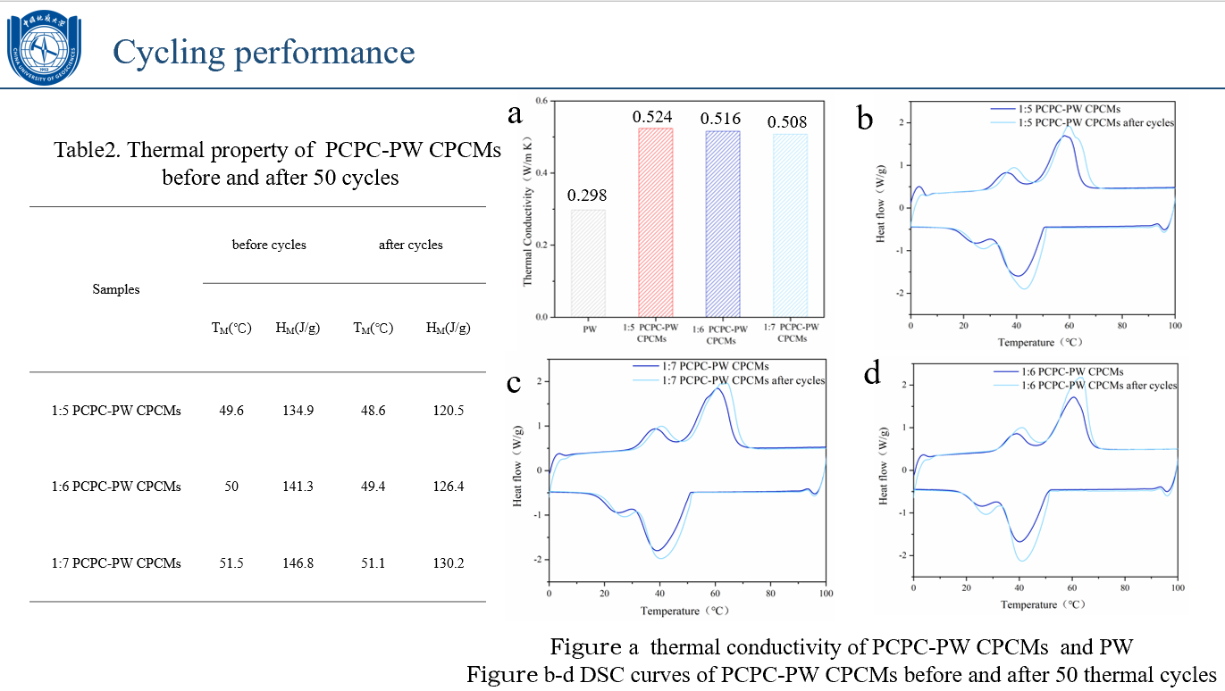 石油焦原料孔径过小难以负载足够多的相变材料,针对此问题,本团队利用盐模板法,以酚醛树脂作为固化剂和粘结剂,通过研磨固化的方法得到石油焦块状样品,然后再将样品内部的氯化钠从而在石油焦内部形成丰富的孔道结构。利用真空浸渍法制得复合相变材料。石油焦多孔碳具有较强的疏水性,可以有效负载石蜡,最高负载量可达69.2%,相变焓达146.8J/g,石油焦多孔碳的存在可以有效提升复合相变材料的导热系数,复合相变材料经多次循环后仍能保持较高的相变焓,具有较好的循环性能。