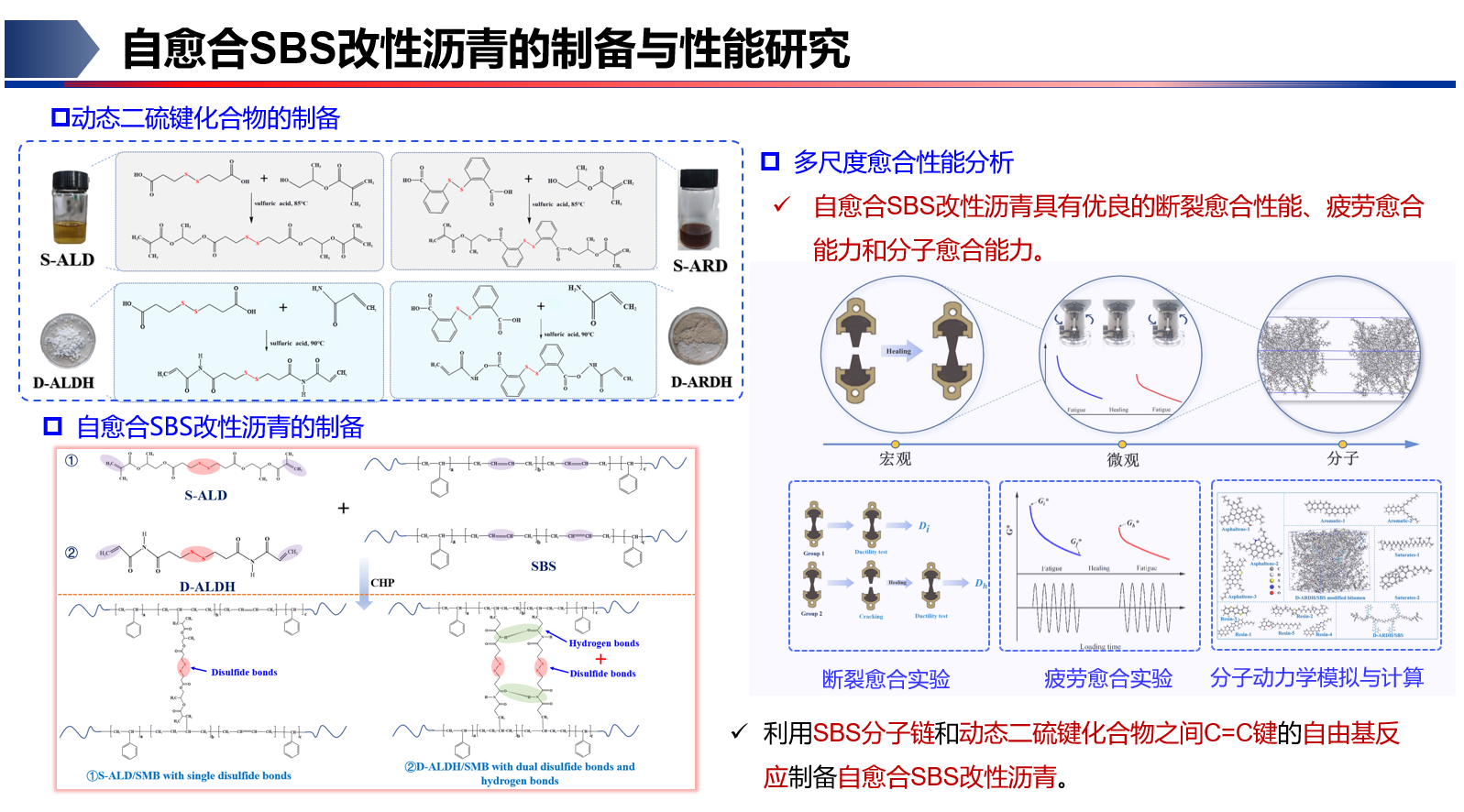 报告中介绍,项目团队创新性的合成了含端C=C键的动态二硫键化合物,通过自由基反应将其引入SBS的分子链间成功制备了新型自愈合SBS改性沥青。研究表明,动态二硫键的引入显著提高了SBS改性沥青宏观-微观-纳米尺度上裂缝的愈合能力。此外,相比普通SBS改性沥青,自愈合SBS改性沥青具有较好的物理性能,这归因于动态二硫键的引入提高了SBS分子链的化学交联程度,使其具有较完善的交联网络结构。