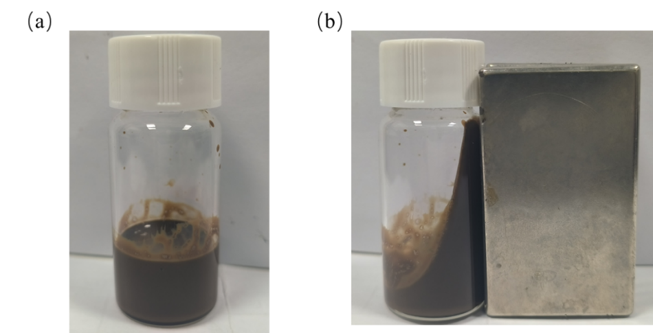 Fig. 3 Appearance of magnetically responsive polymer without (a) and with (b) the magnetic field
