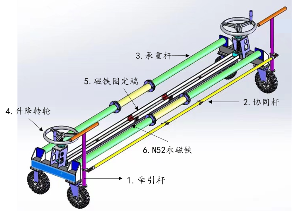 To address the drawback of traditional concrete pavement, gradient enhanced polymer modified concrete for structural use was prepared in this project. Theoretical modeling and laboratory testing confirmed the excellent performance of this gradient structure. For its implementation, the project team innovatively synthesized the magnetically responsive polymer latex (Fig. 3), which can be triggered to move in fresh concrete and enriched in the surface of concrete pavement. In addition, the device used for applying magnetic field in construction site was invented for the application of polymer latex in the road pavement (Fig. 4). This project not only ensures superior pavement performance but also achieves effective cost reduction. The compressive strength of prepared polymer-modified concrete under the polymer dosage of 4% is more than 60 MPa, flexural strength is more than 12 MPa, and the abrasion resistance is less than 0.1 kg/M2.